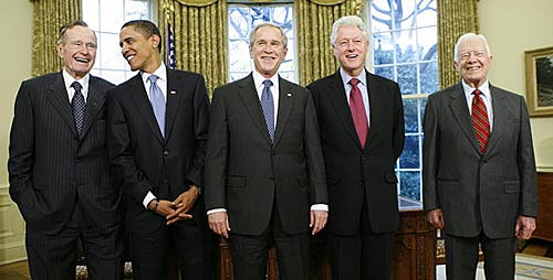 美国现任总统乔治·W·布什(中)邀请第41任总统乔治·H·W·布什(左一)、当选总统贝拉克·奥巴马(左二)、第42任总统比尔·克林顿(右二)和第39任总统吉米·卡特在白宫会晤。