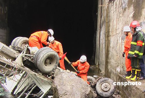 1月7日,贵州印江合水镇一辆双排座小货车,行驶至省道303线75KM处遇凝冻打滑,撞坏公路围挡,翻下40米的悬崖,掉进印江河右岸泄洪洞,造成4人死亡1人重伤的交通事故。 中新社发 陈晓岚 摄