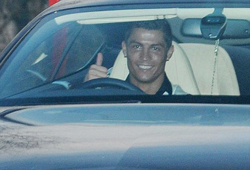 C罗在车祸后,仍然到曼联俱乐部进行训练。图为在离开训练基地时,C罗面对镜头微笑示意。