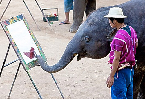 据英国媒体9日报道,泰国清迈有一群有艺术细胞的动物,11岁的亚洲象Lankam是其中一员,它已经创作了数百幅绘画作品,最贵的一幅画甚至卖到2万英镑。
