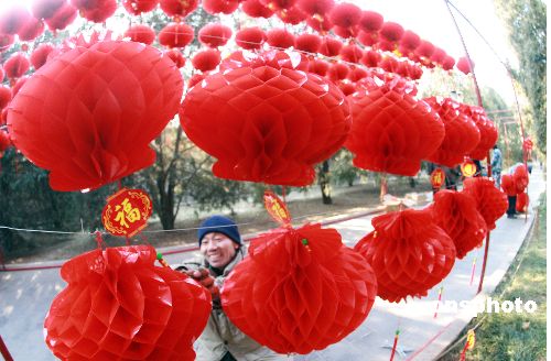 2009年1月9日,随着春节临近,北京地坛公园庙会的环境布置已进入倒计时阶段。众多喜庆的大红灯笼纷纷亮相,成为京城迎春的一道靓丽风景。