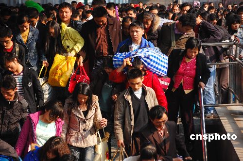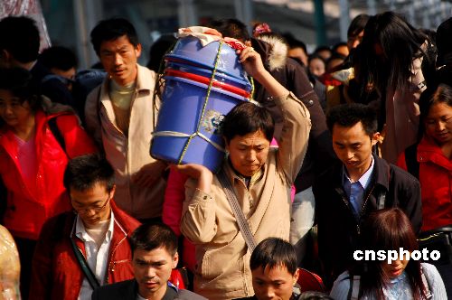 2009年1月10日,重庆北火车站迎来第一波春运客流高峰。由于外出务工人员提前返乡,各大高校开始放假,民工流和学生流融合,重庆火车站在春运前夕迎来了首个客流高峰,重庆市各大汽车站、火车站当日都增开了加班车和临客。2009年全国春运从1月11日开始,到2月19日结束,共计40天。中新社发 许康平 摄