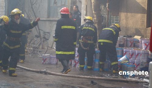 图为火势得到控制后消防人员在浓烟中将一楼仓库中的大量油漆转移出来。中新社发 高新国 摄