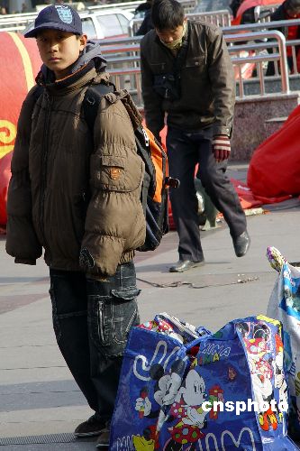 图为郑州火车站广场前一位不足16岁的“小小农民工”。中新社发 李志全 摄