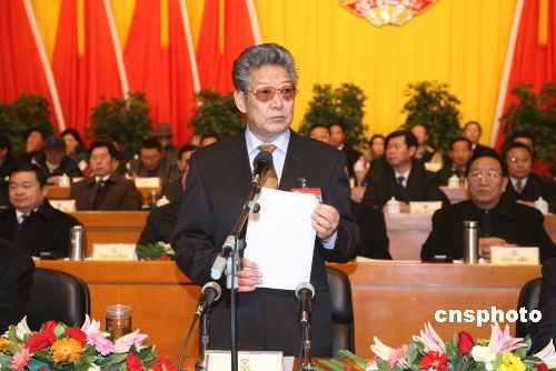 1月12日,西藏自治区政协九届二次会议在拉萨开幕,会期5天。全国政协副主席、西藏自治区政协主席帕巴拉·格列朗杰在大会上致开幕词。中新社发 贾长飞 摄