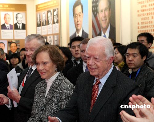 1月12日,美国前总统吉米·卡特先生和夫人在北京参观中美建交30周年图片展览,重温两国建交历史。中新社发 宋吉河 摄