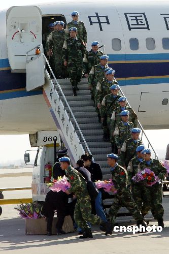 一月十二日上午十时五十五分许,济南军区首批赴苏丹达尔富尔维和部队第一梯队一百六十名官兵,乘坐南航客机平安飞抵郑州新郑国际机场。中国首批赴苏丹达尔富尔维和部队由济南军区组建,共由两个梯队三百一十五名官兵组成。第二批回国的一百五十五人将于本月二十日抵达郑州机场。中新社发 李志全 摄