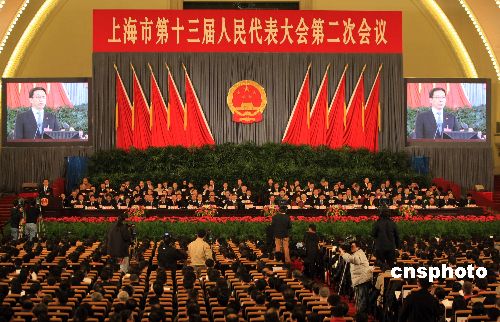 一月十三日上午九时,上海市第十三届人民代表大会第二次会议在上海展览中心中央大厅开幕。上海市长韩正代表市政府向大会作政府工作报告。中新社发 汤彦俊 摄
