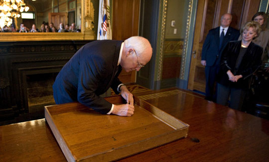 1月12日,即将卸任的美国副总统切尼在艾森豪威尔行政办公楼的副总统办公桌抽屉上签下了自己的名字。这张办公桌造于1902年,它的第一任使用者是罗斯福总统。