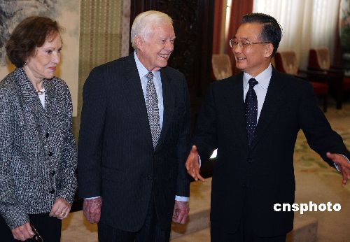 1月13日下午,中国总理温家宝在北京中南海紫光阁会见专程来华参加中美建交三十周年纪念活动的美国前总统卡特一行。中新社发 任晨鸣 摄