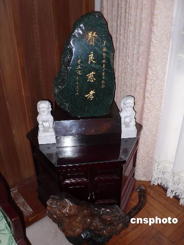 图为七海寓所会客厅里摆放的一块青石,上镌刻蒋介石题写的“贤良慈孝”四个大字。中新社发 路梅 摄