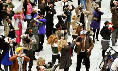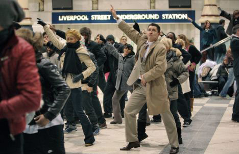 跳舞的人群中既有前来英国观光的旅行者,也有地铁站的工作人员,他们在一瞬间聚集,有组织的表演hip-pop、迪斯科或者舞厅舞步动作,几分钟后又都忽然解散。