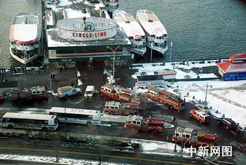 大批救援车辆聚集在哈德逊河边的码头,等待救援落水乘客。 中新社记者 魏晞 摄