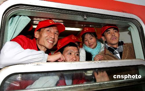 福建省首趟农民工返乡专列(福州—成都)1月15日11时38分启程。在福建省总工会、中国移动福建公司、南昌铁路局福州办事处等多个部门的关心下,来自四川、陕西等地的650多名在闽务工人员,乘坐由福州开往成都的K392次列车踏上返乡过年之旅。其中20名家在四川地震灾区的农民工还获得免费车票。中新社发 杨婀娜 摄