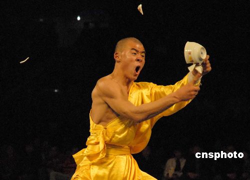 图中武僧用一根手指连破十来个瓷碗,令观众叹为观止。中新社发 刘冉阳 摄