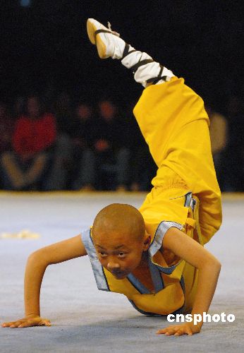 图为少林小弟子表演一种新的拳路—少林象形拳之蝎子拳。中新社发 刘冉阳 摄