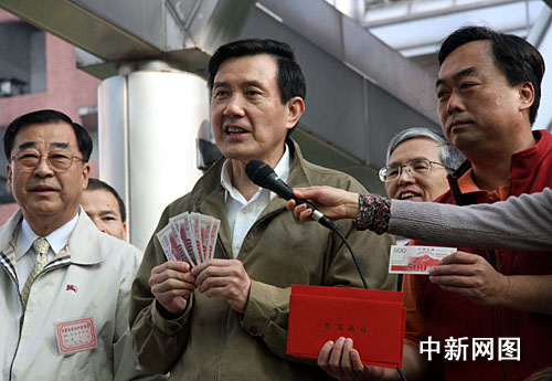 1月18日上午,备受全台和外界关注的消费券开始在台湾各发放所发放。图为马英九今天上午九时许来到台北市第1291号消费券发放所领取消费券。马英九随后发表讲话,呼吁台湾全体民众善用消费券,积极促进内需,扩大消费。陈立宇 摄