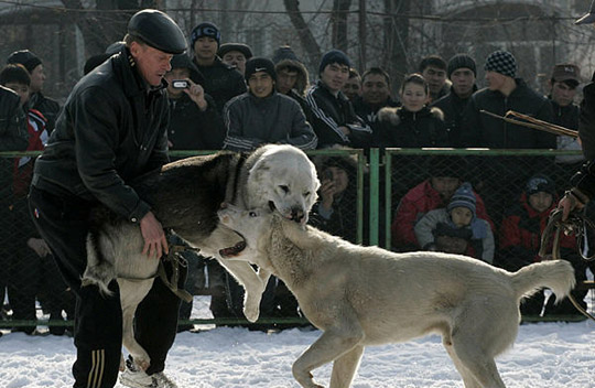 1月18日,吉尔吉斯斯坦首都比什凯克,一家养犬俱乐部组织了一场斗狗大赛,约有50名养犬爱好者携爱犬参加。