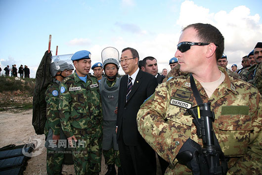 黎巴嫩当地时间17日,正在中东进行外交斡旋的联合国秘书长潘基文在视察联合国驻黎巴嫩维和部队时,专程前往蓝线接见了中国赴黎维和工兵营扫雷官兵。