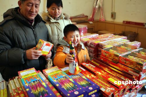 一月十九日,是北京2009年春节烟花爆竹销售的首日,北京举行声势浩大的燃放烟花爆竹注意安全的宣传咨询活动。在主会场,警方除聘请演员潘长江、郭冬临作为宣传大使外,还向市民发放宣传品,增强市民的安全意识。图为市民在熊猫烟花的定点销售处踊跃购买烟花。中新社发 任海霞 摄