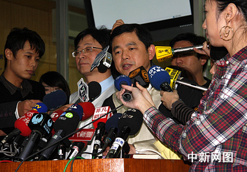 1月19日,台北地方法院首次开庭审理前台湾地区领导人陈水扁家弊案。传讯陈水扁到地院准备程序庭。图为庭审后陈水扁委任律师郑文龙(左三)、石宜琳(左二)举行记者会。中新社记者 陈立宇 摄