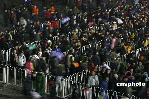 2009年1月19日晚,北京西客站客流大幅攀升,广大旅客通过S形护栏有序进站。面对今年的春运客流,北京西站充分借鉴奥运场馆观众分流经验,提前部署,及早安排,在客流密集的北广场东西双向设置了两处S形护栏,由工作人员在入口处指挥,分流、引导旅客有序进站,确保了春运安全。 中新社发 鲁谷 摄