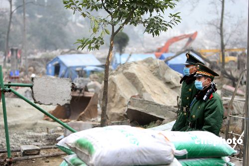 1月20日,几乎被夷为平地的2008年四川大地震震中映秀镇被连日的阴云薄雾所笼罩,武警部队严守警戒线,只有施工与防疫人员每天进入拆除倒塌建筑并消毒防疫。中新社发 任晨鸣 摄
