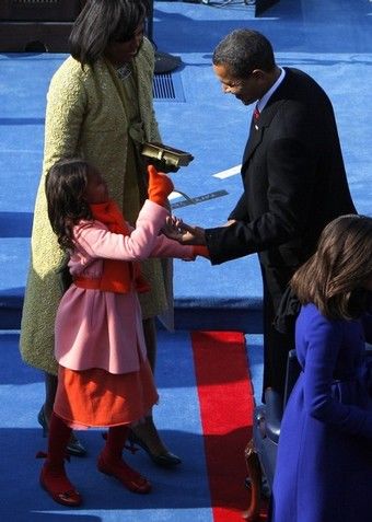 奥巴马的小女儿萨莎在父亲宣誓后竖起大拇指。