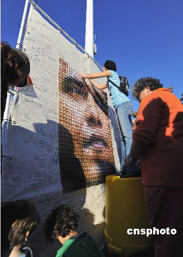 图为观众在一个由纸鹤组成的奥巴马总统像上签名,表达和平心愿。