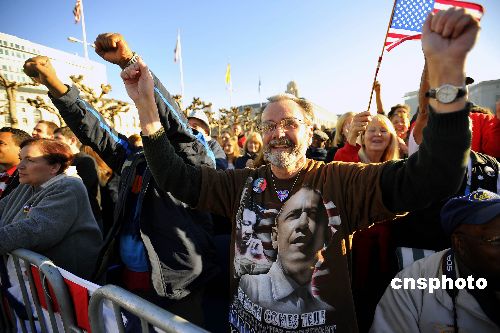 图为旧金山人欢庆奥巴马就职美国总统。中新社发 陈钢 摄