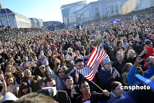 旧金山人们在市政府广场同步观看美国第四十四任总统奥巴马就职典礼。中新社发 陈钢 摄