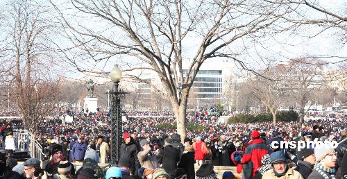美国数十万民众冒着严寒到现场见证这一历史性时刻。中新社发 李静 摄