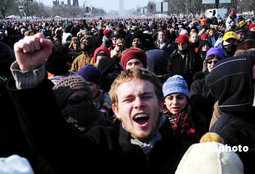 图为在场民众振臂高呼奥巴马竞选名言“Yes! We Can”。中新社发 邱江波 摄