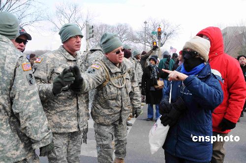 为应付突发事件,协助警方维持秩序,当局出动万名国民警卫队官兵站立街头,协助维持就职典礼秩序。图为士兵为迷路者指路。中新社发 邱江波 摄