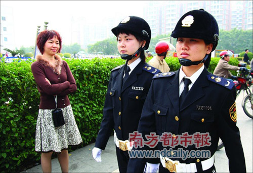 昨日上午9时,挂牌仪式后,22名女队员正式开拔上路,全程腰板挺直。中午休息时间,一台台电瓶车返回临时办公点后,这群姑娘们终于表现出与年龄相称的活跃。第一件事是摘下沉重的头盔,几乎人手一把梳子,抢位子梳头、换装,唧唧喳喳地聊天、打电话,有的则不忘先把今天的首日秀先拍下留念。