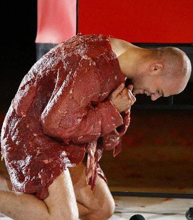 2008年7月19日,在克罗地亚的斯普利特,一名演员身穿生肉制成的演出服在舞台上表演。