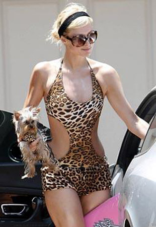 爱出风头的帕丽斯·希尔顿不仅要把自己打扮得漂漂亮亮,就连她的宠物狗也不放过。帕丽斯外出时穿上一套性感的豹纹装,并给她的宠物狗也穿上了一件同款豹纹装,上面还带有一条黑色的蕾丝裙边,十分抢眼。