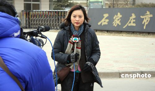 图为当日上午,在石家庄中级法院门口,来自香港的电视台记者冒着寒风做现场报道。中新社发 翟羽佳 摄