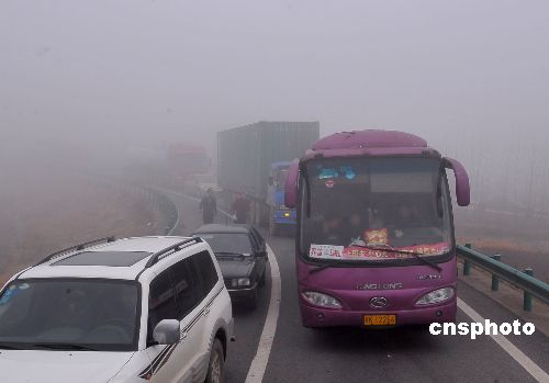 1月22日,受北方南下冷空气与当地暖湿气流交汇影响,当天清晨5时左右起,安徽滁州遭受大雾袭击,境内宁洛、沪陕、京台高速能见度在50至100米,严重影响春运期间的交通安全。大雾期间,滁州高速交警对辖区所有高速入口全部实行暂时封闭,在增派干警加大路面巡逻力度的同时,还安排警车引导车辆行驶。截至上午10时左右,浓雾逐渐散去,所有高速道口实行了间段放行。中新社发 王家国 摄