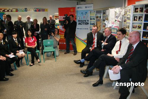 图为米利班德(右二)和弗格森(右三)与该校师生在一起座谈。