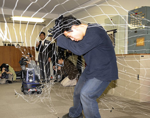 据英国媒体报道,日本一公司近日展示了一款保安机器人。这款改进型保安机器人装有新型传感器,可以自动发射网状物将窃贼套住,并将现场图像发到主人的手机上。
