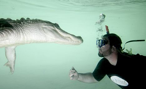 据英国媒体报道,1月22日,美国佛罗里达州迈阿密市丛林岛动物园的员工西恩·曼宁(Sean Manning)不穿戴任何保护性衣物进入鳄鱼池“与鳄共舞”。