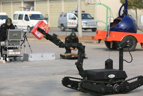 会搬运炸弹的机器人:在武汉举行的一场反恐演练中,武警战士使用机器人搬运“炸弹”。