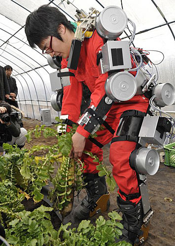 能“附体”的机器人:日本研究人员成功发明了一种帮助人们从事体力劳动的特殊服装。穿上这种由电子机械设备组装而成的“衣服”,人在劳动时仿佛多了一个机器人帮手,就像在人体上附上了一个机器人。