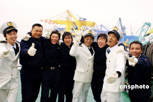 江苏籍贯的“振华4号”船员斗志昂扬地在甲板上向江苏家乡父老欢呼。中新社发 李根 摄