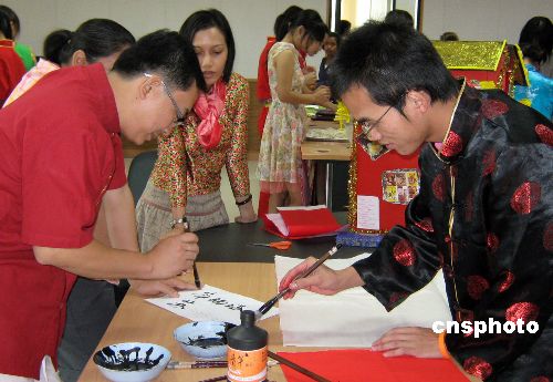 1月25日,中国农历大年三十。由中国广西大学与泰国川登喜皇家大学合办的泰国素攀孔子学院举行了2009年迎新春文艺及游园会,素攀孔子学院院长郭宇路(左一)教泰国师生练习中国书法。中新社发 谭淑玲 摄