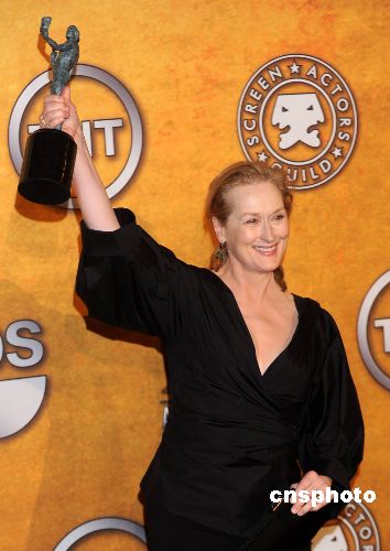 号称奥斯卡主要风向标的第十五届美国演员工会奖(SAG)一月二十五日晚在洛杉矶揭晓。美国老牌影星梅丽·史翠普(又译梅丽尔·斯特里普)凭借《虐童疑云》(Doubt)夺得电影类剧情片最佳女主角奖。梅丽·史翠普刚刚获得奥斯卡最佳女主角提名,从而以十五次入围奥斯卡缔造了历史纪录。中新社发 张炜 摄