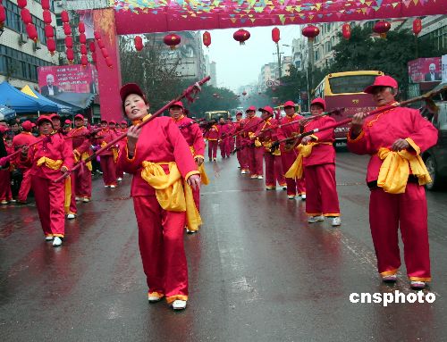 1月26日,正月初一,四川华蓥市举行民俗文化排街展演,10余个精彩地方民俗节目,吸引了数万市民观看。中新社发 杨天军 摄