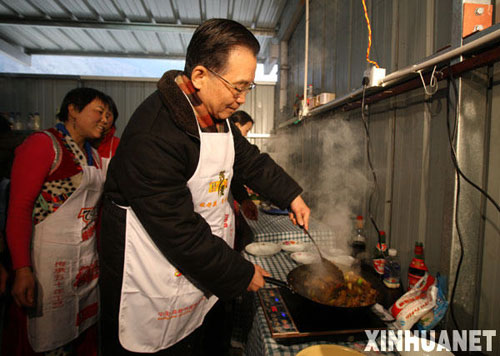 1月25日,温家宝总理在汶川映秀镇板房安置小区吴志远等几家合用的厨房里炒菜。1月24日至25日,中共中央政治局常委、国务院总理温家宝来到四川受灾最为严重的北川、德阳、汶川等地,和灾区人民一起过年。作者:姚大伟