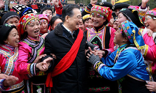 1月24日至25日,中共中央政治局常委、国务院总理温家宝来到四川受灾最为严重的北川、德阳、汶川等地,和灾区人民一起过年。这是1月24日,温家宝在北川县擂鼓镇猫儿石村看望羌族群众。作者:姚大伟
